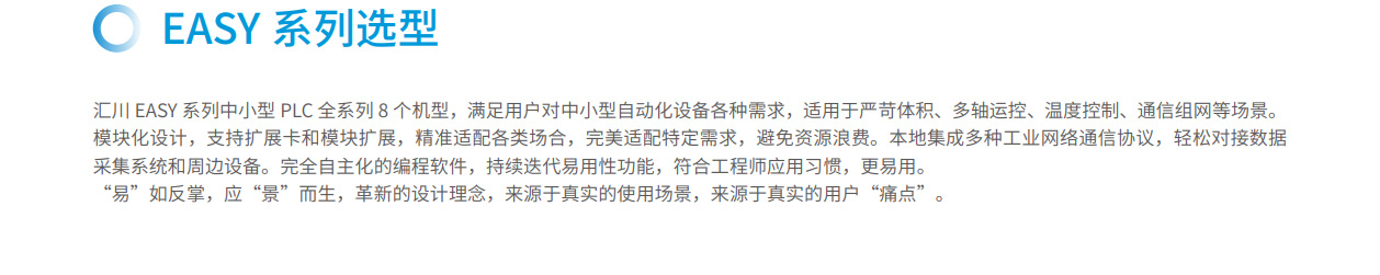 匯川EASY系列全場景緊湊型中小型控制器全系列8個機型,滿足用戶對中小型自動化設(shè)備各種需求,適用于嚴苛體積、多軸運控、溫度控制、通信組網(wǎng)等場景。機身模塊化設(shè)計,支持擴展卡和模塊擴展,精準適配各類場合,完美適配特定需求,避免資源浪費。本地集成多種工業(yè)網(wǎng)絡(luò)通信協(xié)議,輕松對接數(shù)據(jù)采集系統(tǒng)和周邊設(shè)備。完全自主化的編程軟件,持續(xù)迭代易用性功能,符合工程師應(yīng)用習慣,更易用。 “易”如反掌,應(yīng)“景”而生,革新的設(shè)計理念,來源于真實的使用場景,來源于真實的用戶“痛點”。