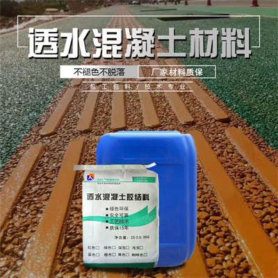 透水混凝土膠結(jié)料是以高強(qiáng)度硅酸鹽水泥為基料,配以多種助劑增加強(qiáng)度與粘結(jié)力組成的粉狀料,并可按用戶要求加入無(wú)機(jī)耐磨顏料,使其和碎石、水按照一定比例混合后,組成不同色彩的水混凝土面層。