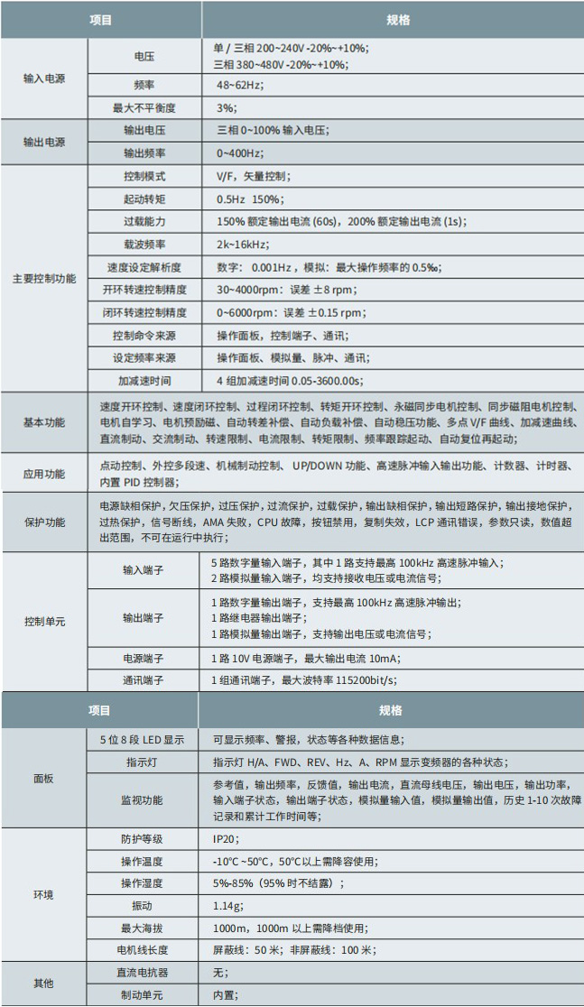 點動控制、外控多段速、機械制動控制、UP/DOWN功能、高速脈沖輸入輸出功能、計數器、計時器、內置PID控制器;