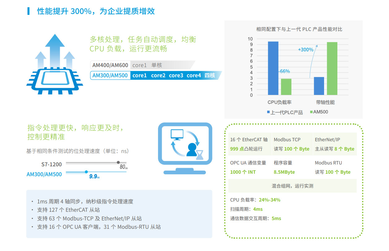 AM500系列是匯川技術(shù)推出的新一代標(biāo)準(zhǔn)型中型PLC,其設(shè)計開發(fā)完全符合PLCopen規(guī)范和IEC-61131-3標(biāo)準(zhǔn),支持ST,LD,SFC,CFC等編程語言,以其小巧的CPU體積、模塊化靈活組合及高節(jié)拍生產(chǎn)特性可適應(yīng)更多的應(yīng)用場景。支持EtherCAT、EtherNet/IP、OPC UA、Modbus TCP(支持兩路同一網(wǎng)段的IP地址)、TCP/IP、RS485(最大可擴(kuò)展至3路)、CAN總線等全球標(biāo)準(zhǔn)的工業(yè)網(wǎng)絡(luò)。主要應(yīng)用于食品飲料、包裝、印刷、硅晶、醫(yī)療、SMT周邊等單機(jī)自動化設(shè)備及單機(jī)組合產(chǎn)線,滿足生產(chǎn)效率及控制精度提升場景需求。其開發(fā)編程平臺InoProShop覆蓋從多軸復(fù)雜應(yīng)用、離散單機(jī)應(yīng)用到基本邏輯應(yīng)用,可搭載匯川技術(shù)基于ISA88標(biāo)準(zhǔn)開發(fā)的InoQuickPro標(biāo)準(zhǔn)化編程模板框架,實現(xiàn)規(guī)范的標(biāo)準(zhǔn)化管理開發(fā),降低人才培訓(xùn)成本。