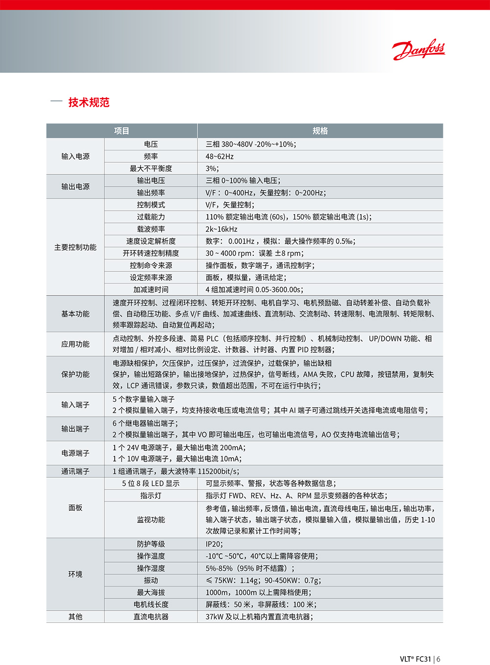 VLT? FC31 系列是丹佛斯結(jié)合實際工程應用需求研制的針對風機、水泵、暖通空調(diào)等低負載市場的工 程型產(chǎn)品,集成了風機、水泵應用相關工藝,可廣泛應用于供水、供熱、污水處理、HVAC 和項目改造 等領域。